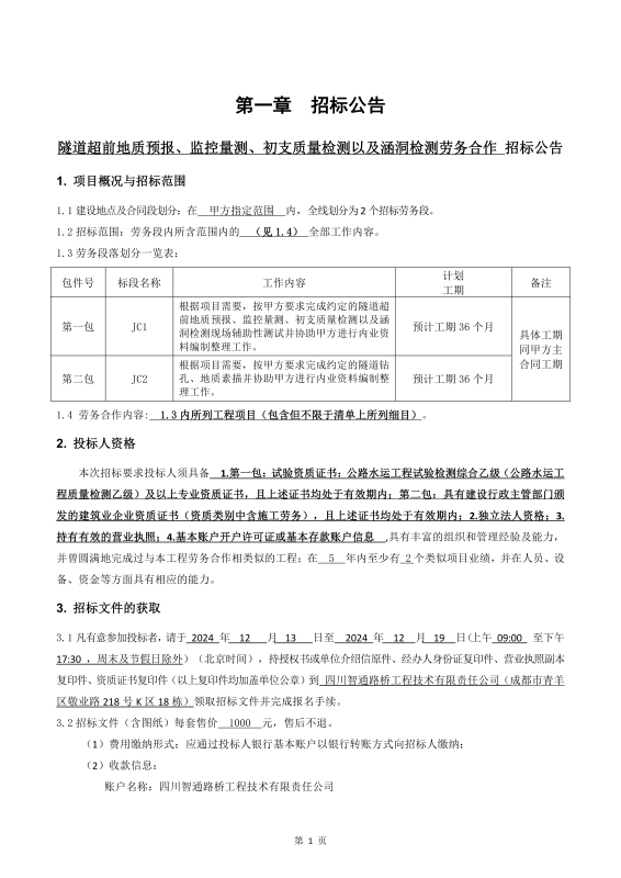 隧道超前地質(zhì)預(yù)報(bào)、監(jiān)控量測(cè)、初支質(zhì)量檢測(cè)以及涵洞檢測(cè)勞務(wù)合作招標(biāo)公告